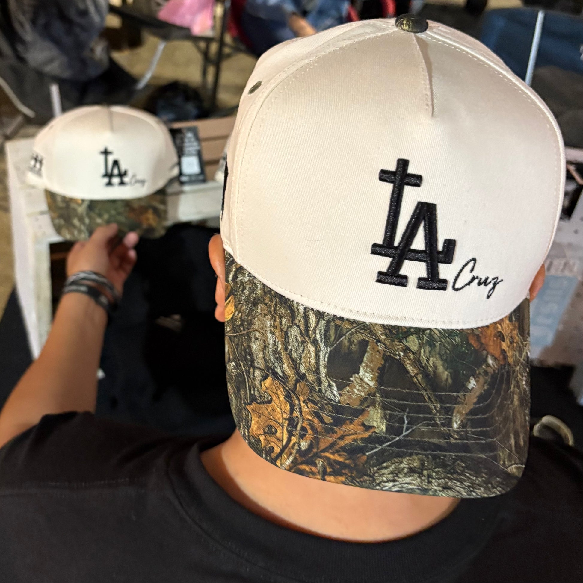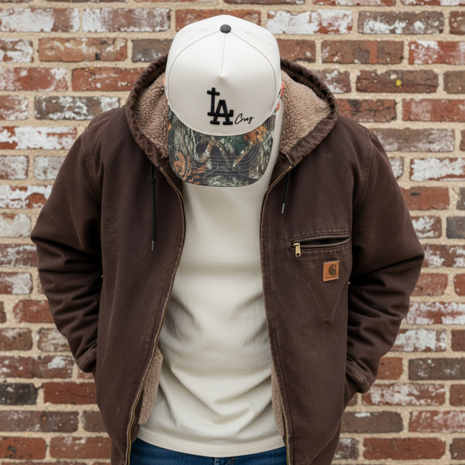 Camo and Cream color snapback hat. Features a unique "LA Cruz" design 3D embroidered on front of the hat, 3kruces logo on right side. 1 Cor 1:18 on the left side.